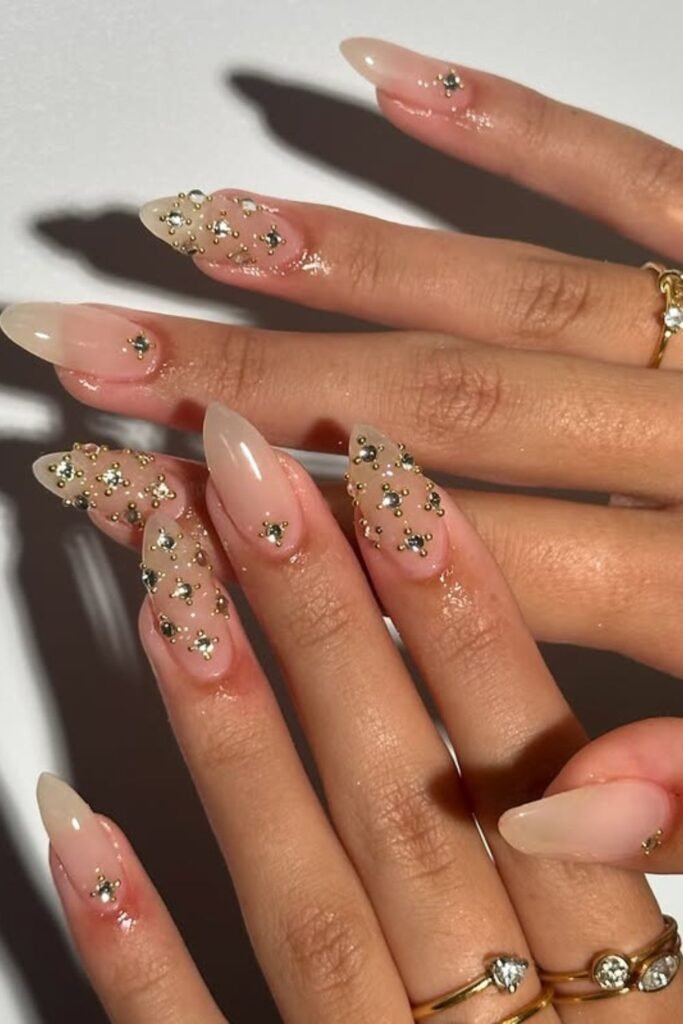 Soft nude tips take on a party mood once those tiny gems start catching the light. This idea is great for sophisticated nights when you want something classy that still stands out.
