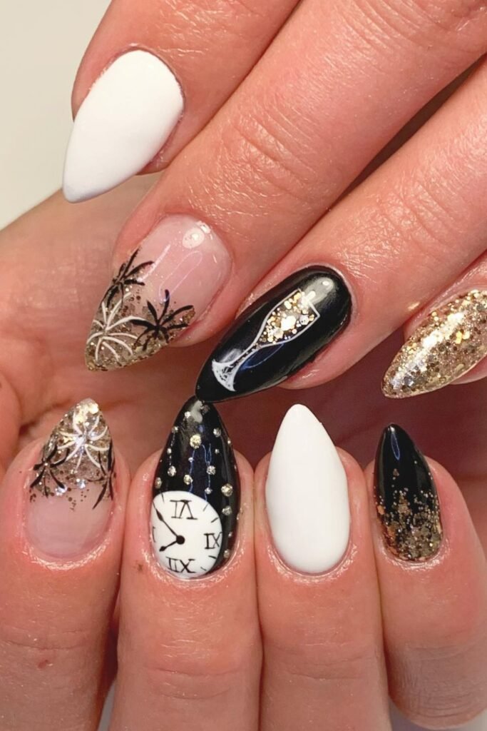 Party energy shows up right away here through the mix of gold glitter, bold black, and that tiny clock detail ready to strike midnight.