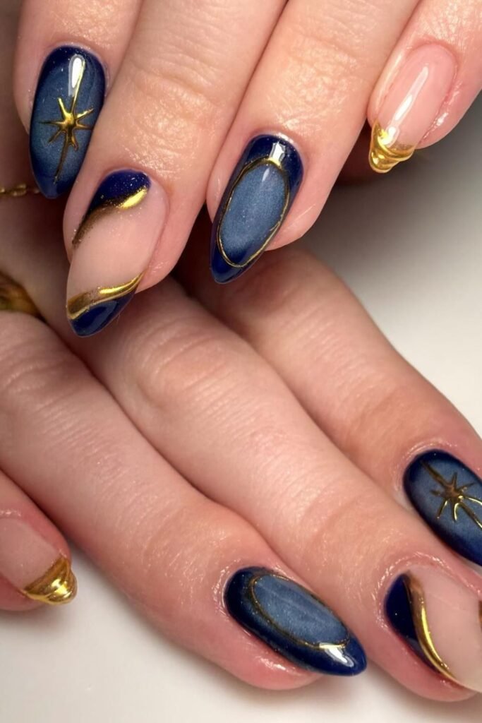 Rich blue polish gives the whole set a moody, dressy base, while those metallic gold curves pull everything into a New Year’s vibe instantly.