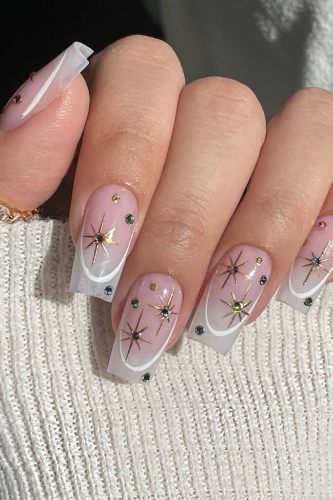 Bright gems and gold stars instantly lift this soft pink-to-white base into party territory.