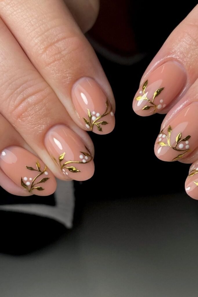 Soft nude polish lays the calm base here, letting the metallic leaves stand out without feeling too heavy for everyday wear.