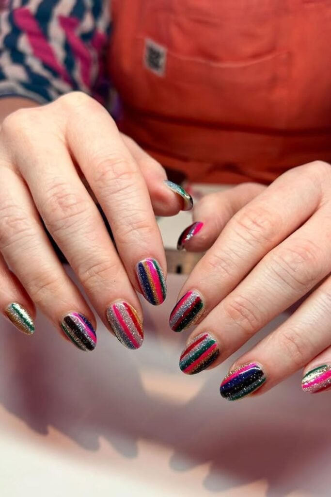 Bold stripes in glittery colors instantly bring a fun, party-ready mood to your nails, especially for a lively New Year’s night.