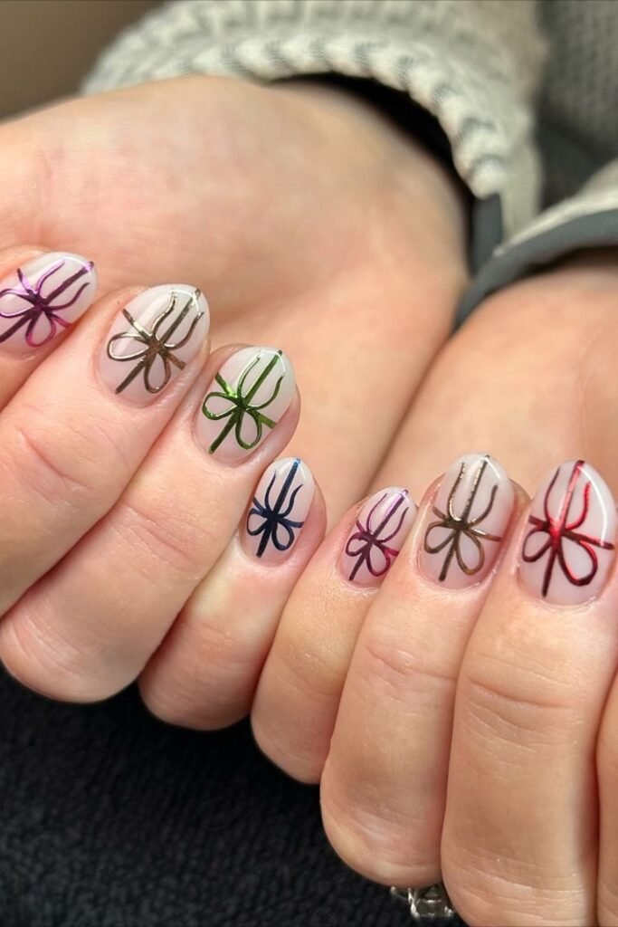 To make it again, start with a sheer nude base and then use a small liner brush to draw ribbon loops in different metallic colors.