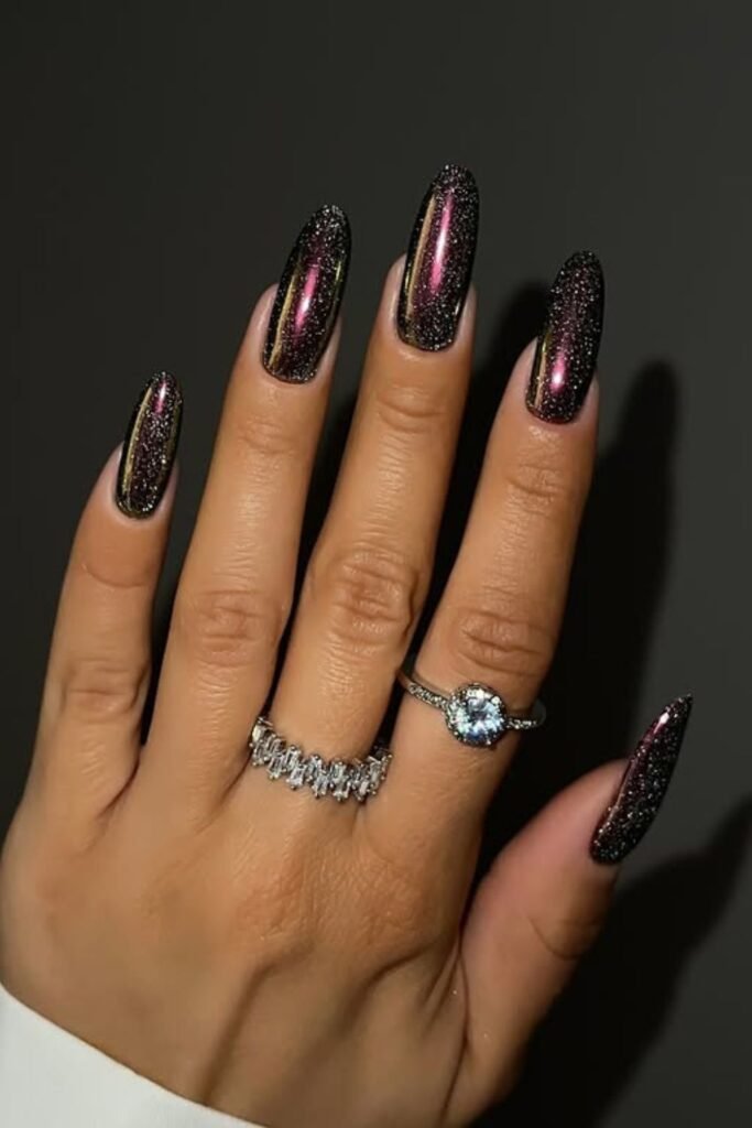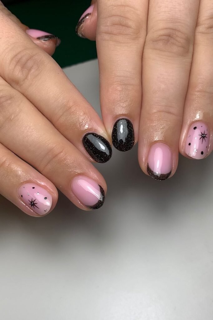 Soft pink and black glitter are a clean way to create drama without going all the way to dark for New Year’s. This is a great way to appear cute and still feel joyful amid party lights.