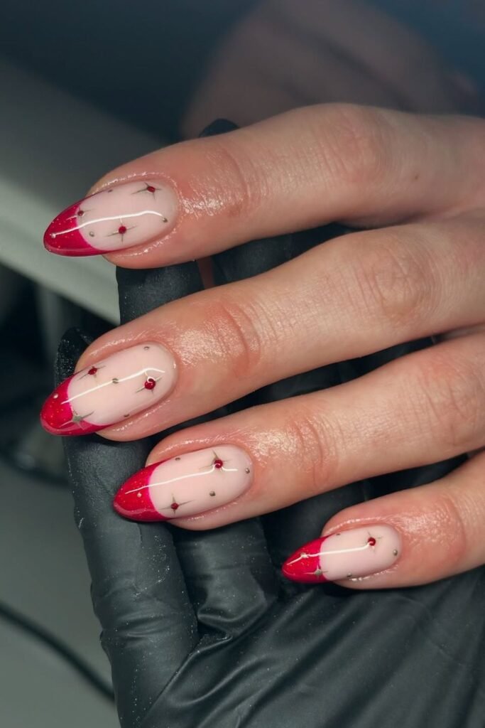 To do it again, start with a sheer nude foundation, paint sharp red French tips, and put small stars or dots in the middle of the nail.