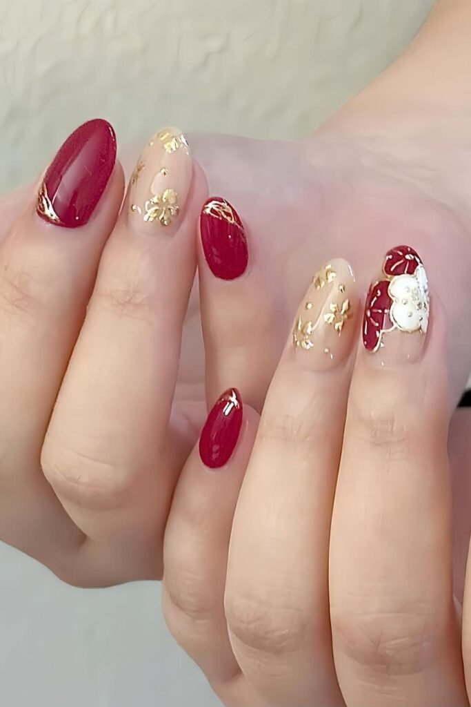 Rich red polish mixed with gold floral accents gives you an elegant New Year style that looks polished without feeling heavy.