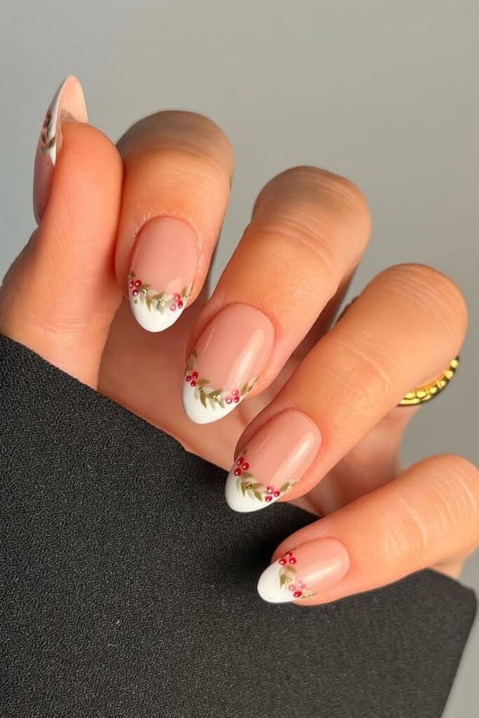 Tiny red berries and soft green leaves along a crisp white French tip give your nails a cute, polished look that still fits the New Year season.