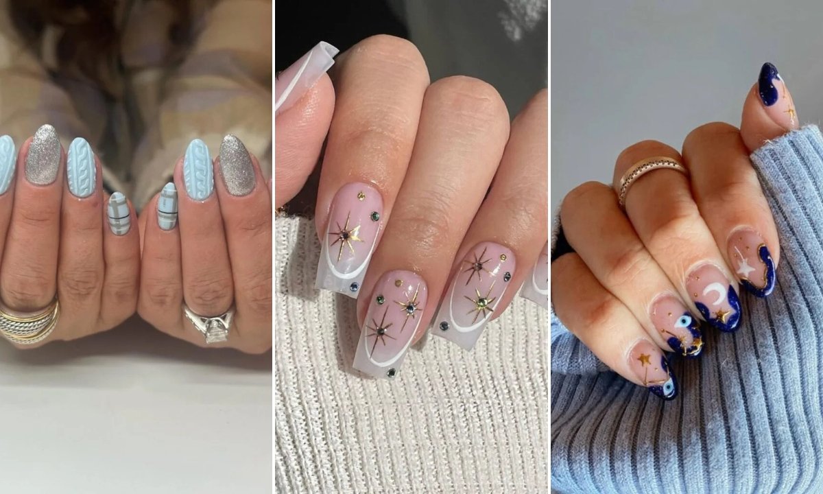 To copy this style, use a matte baby blue base on most of your nails, then use gel to make the raised knit lines.