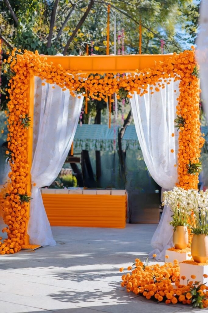 Let oranges take the lead at the ceremony by framing the mandap with marigolds, then soften everything using sheer white draping.