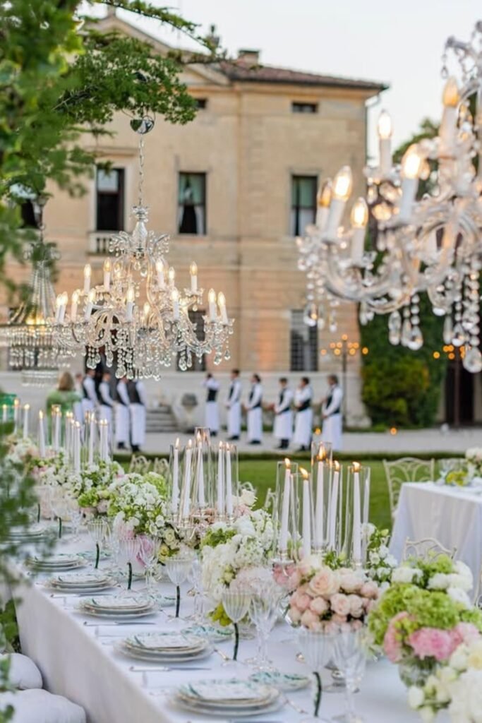 Hanging chandeliers outdoors instantly turns a simple dinner setup into something elegant and cinematic, especially when paired with long banquet tables.