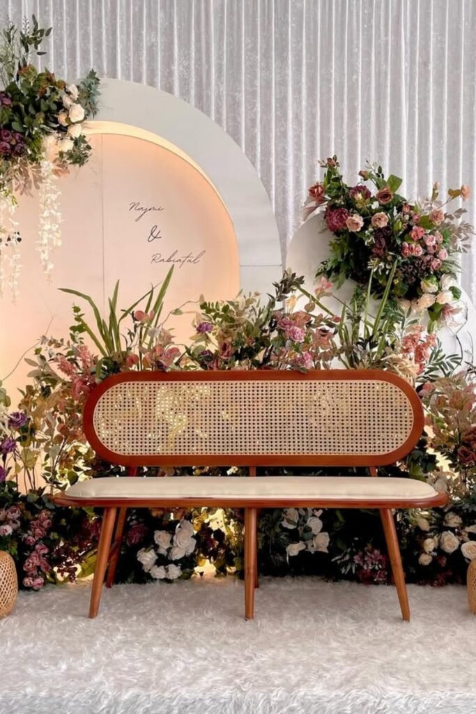This setup works beautifully for reception stages where guests focus forward and the décor needs visual impact without overwhelming.