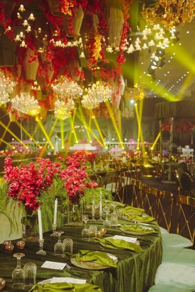 This reception setup leans bold, using deep green linens with vibrant pink florals to create a moody yet luxurious evening atmosphere.
