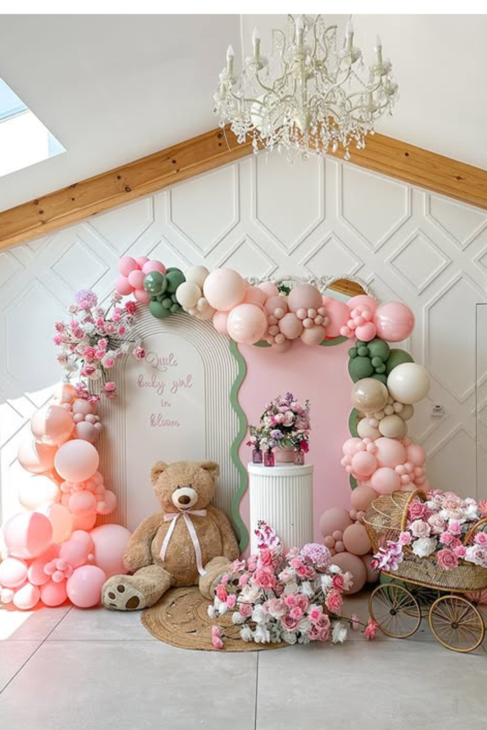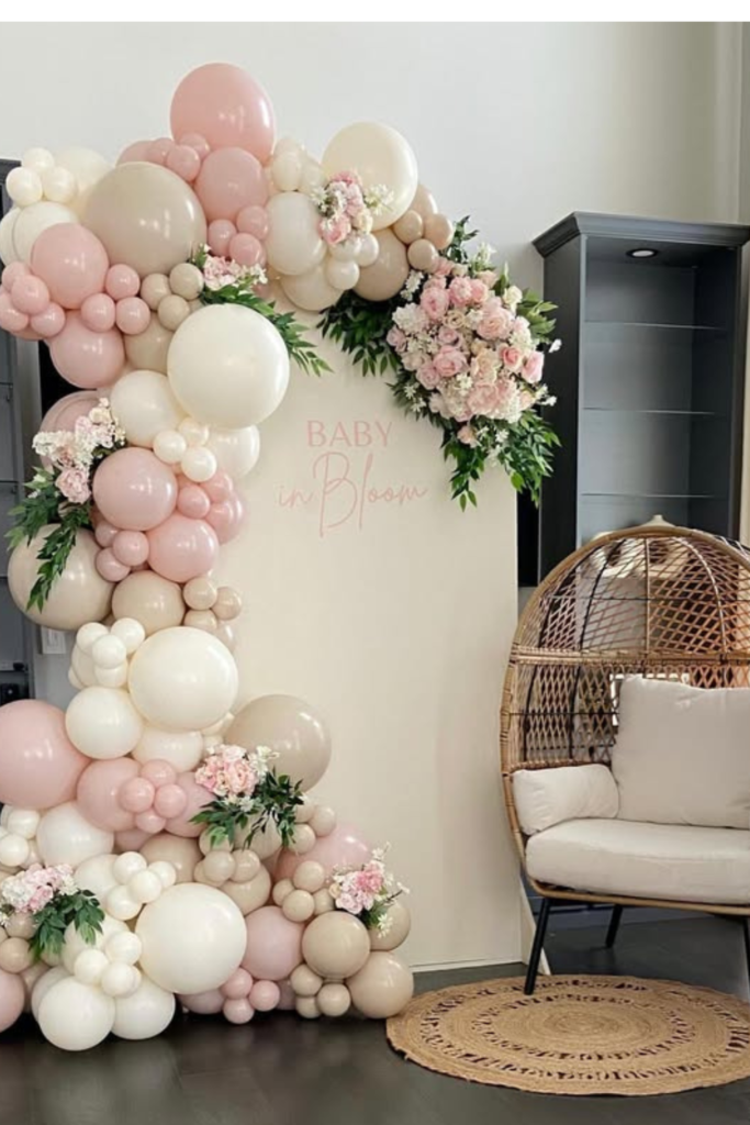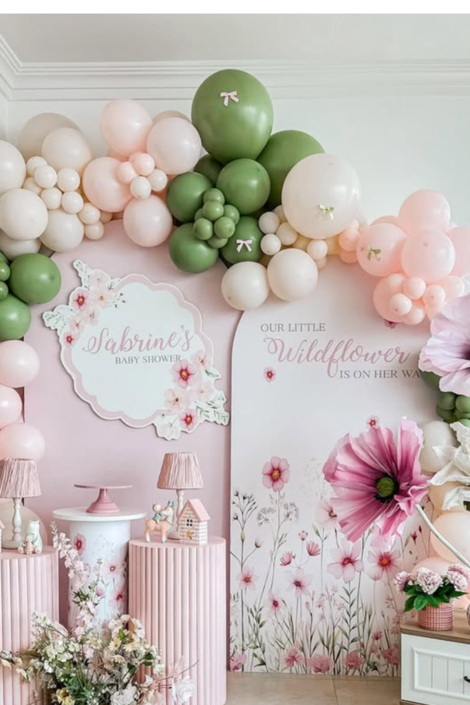 Mixing blush balloons with soft sage instantly gives the entire setup a fresh, garden-inspired feel.