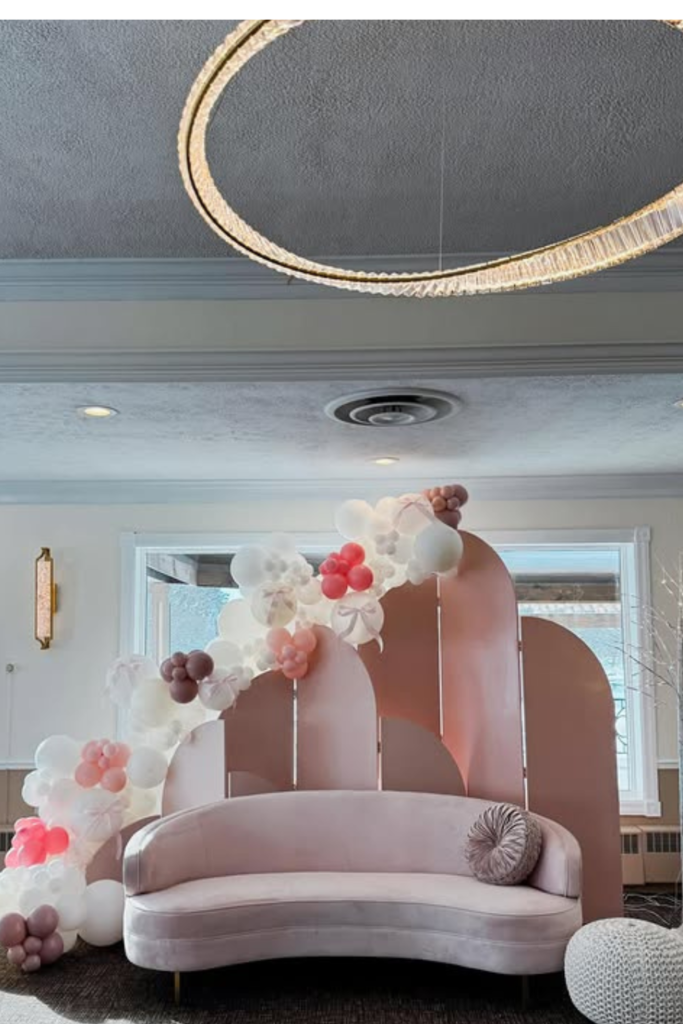 Soft amber lights paired with blush balloons instantly create a cozy, almost golden-hour vibe -even indoors.
