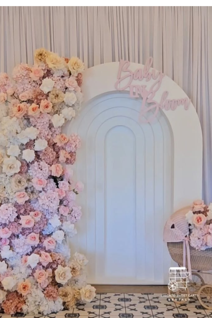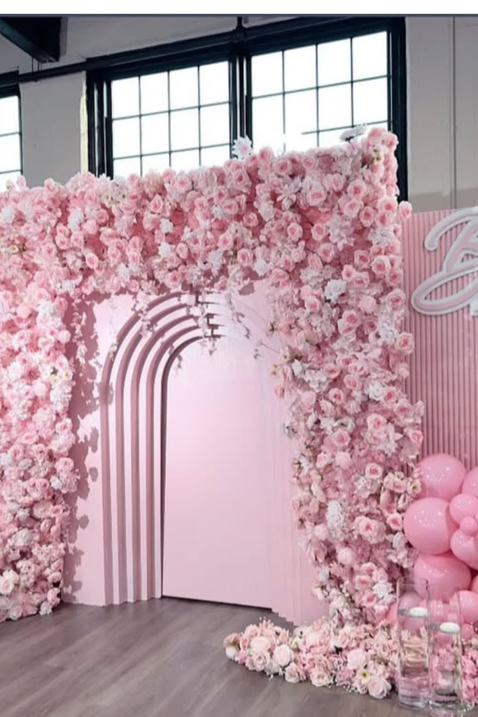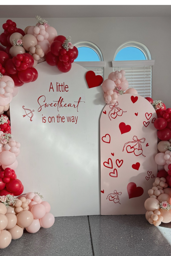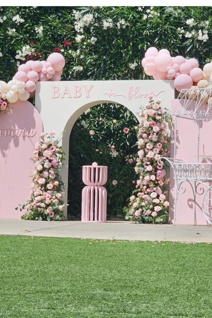 This setup works beautifully for a floral garden or “Pretty in Pink” theme where you want romance without balloons taking over the scene.