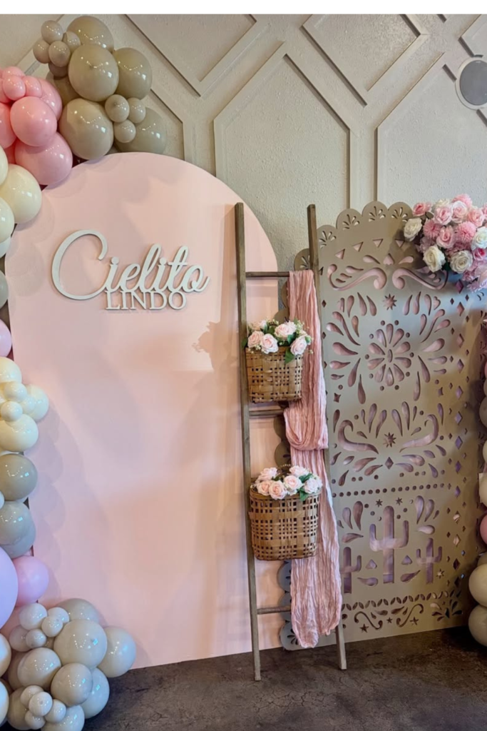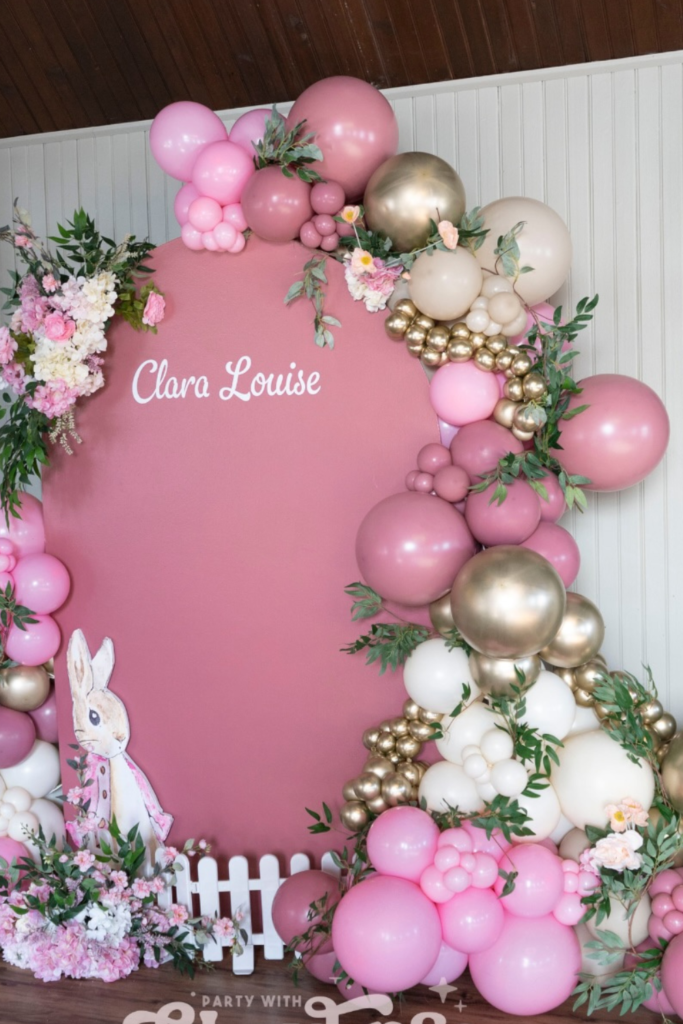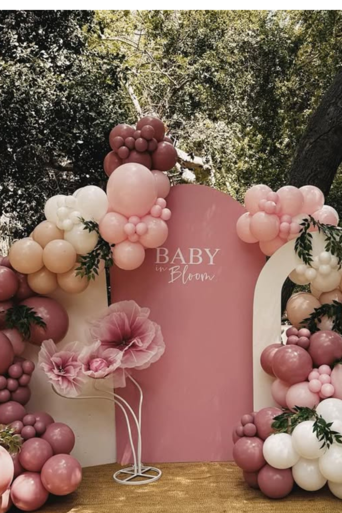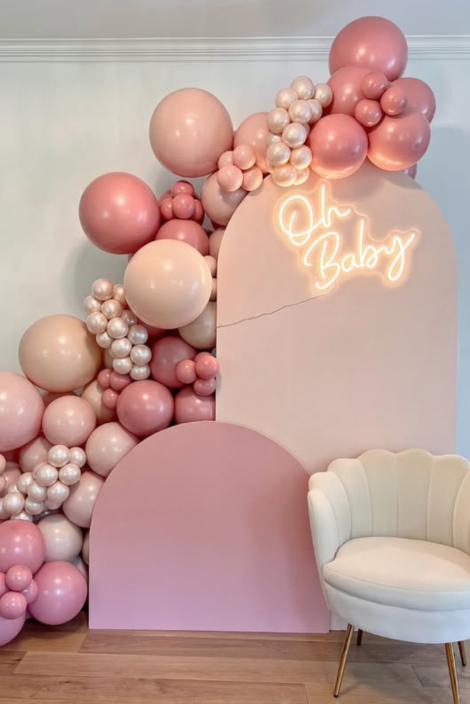 A blush arch backdrop paired with layered balloon clusters creates depth without needing a million decorations.