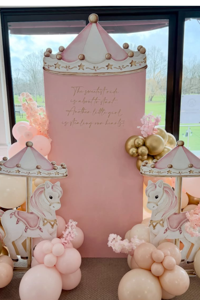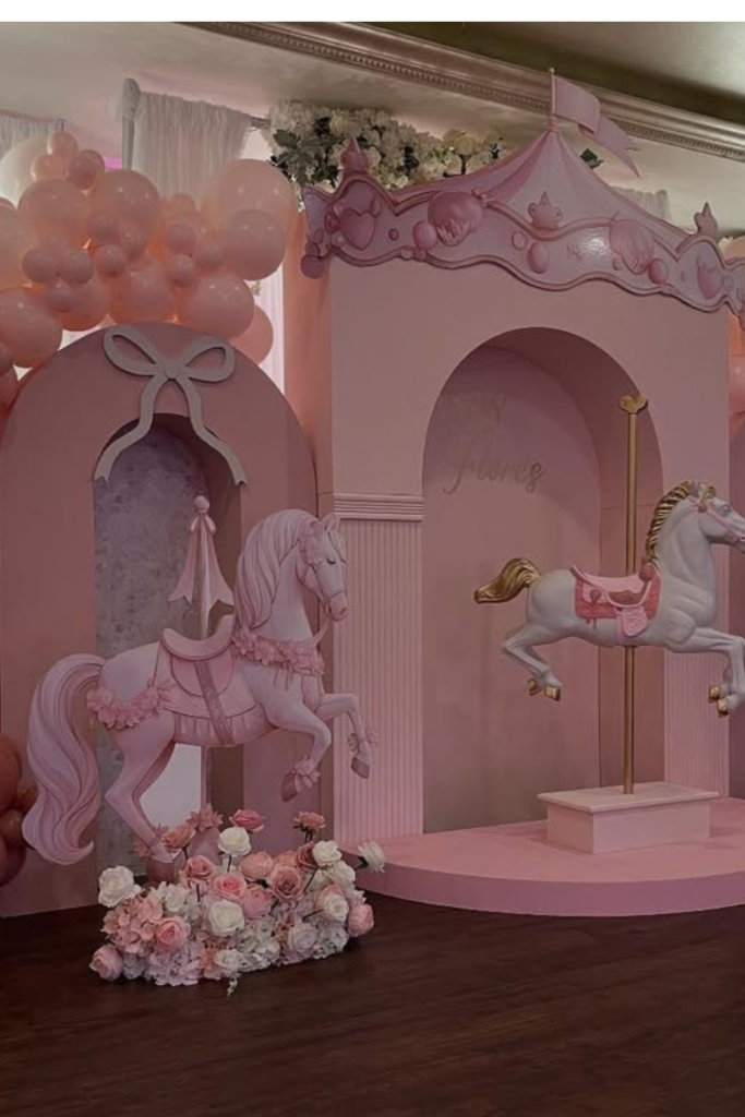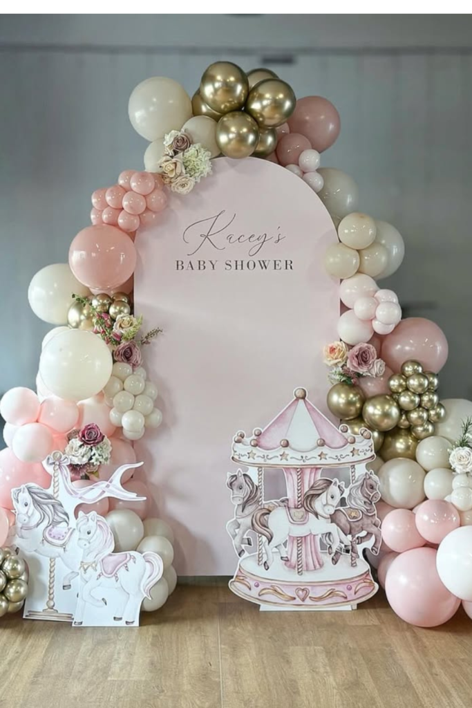 If you want princess energy without going overboard, blend carousel elements with a neutral balloon palette.