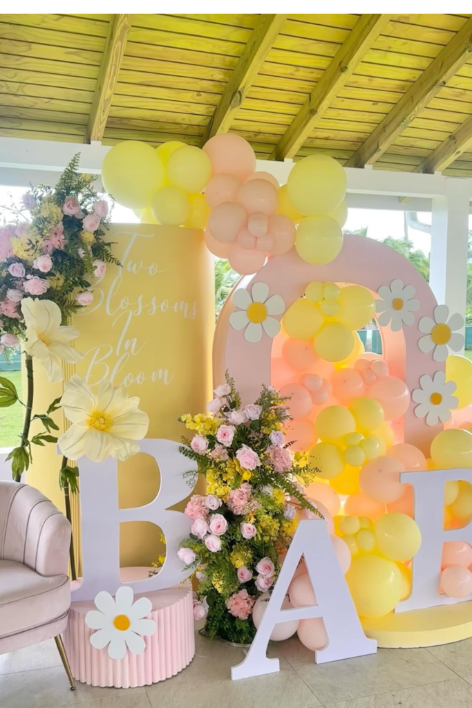 A raised stage with oversized bows, layered balloon arches, and stacked BABY blocks creates a true focal point.
