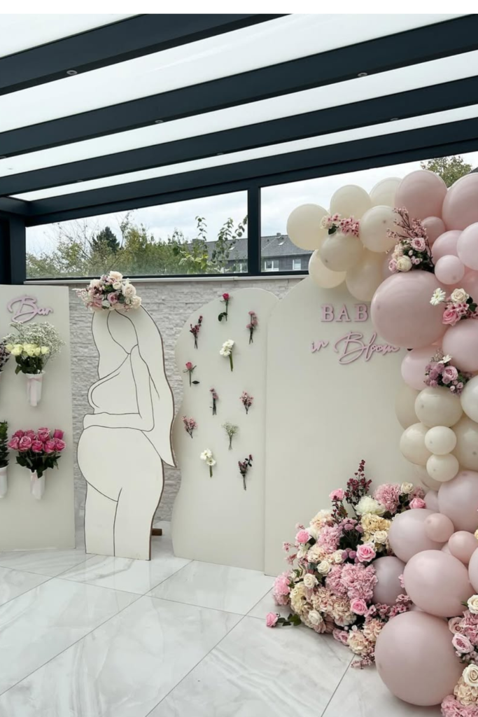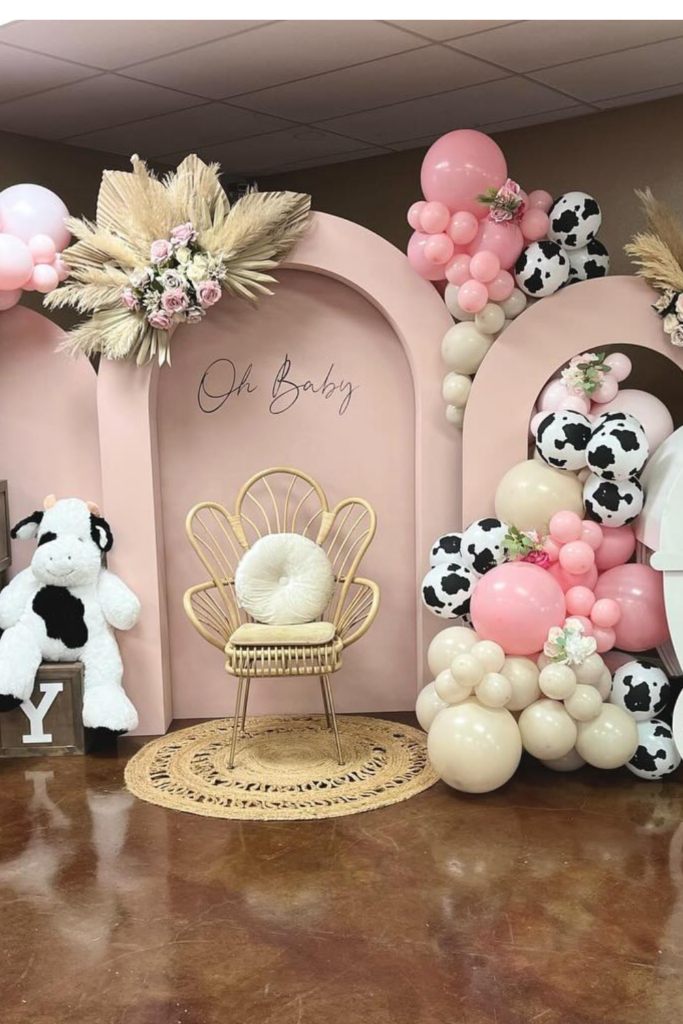 A pink statement wall framed with balloons, greenery, and metallic accents instantly feels tailored to the mom-to-be.