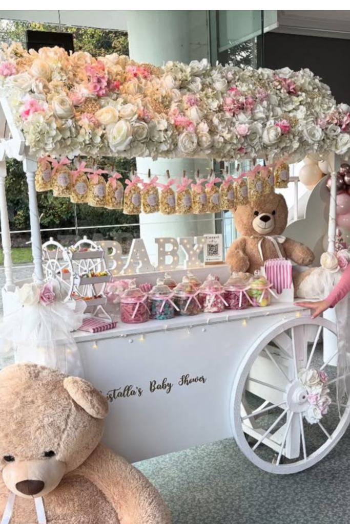 If you’re going for soft and charming, a teddy bear dessert cart is such a sweet focal point.