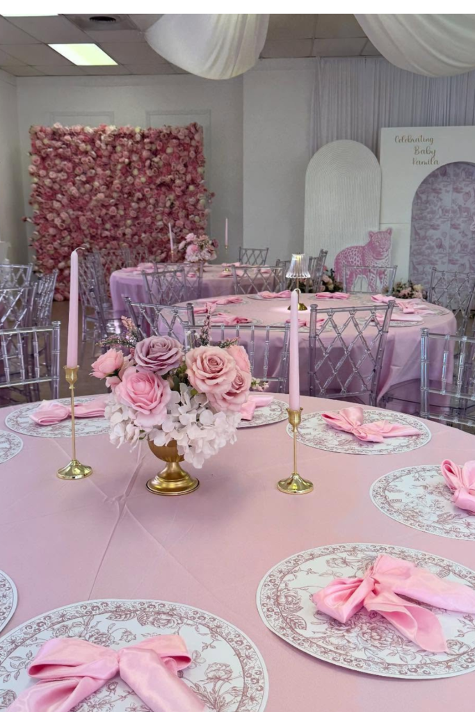 Notice how the pink isn’t loud -it’s layered through florals, napkins, and subtle backdrop details instead of overwhelming the room.
