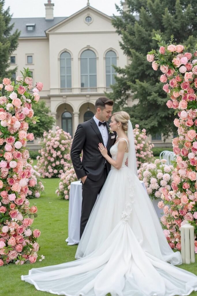 This works best for outdoor ceremonies where natural light softens pink tones and the venue architecture already provides a classic backdrop.