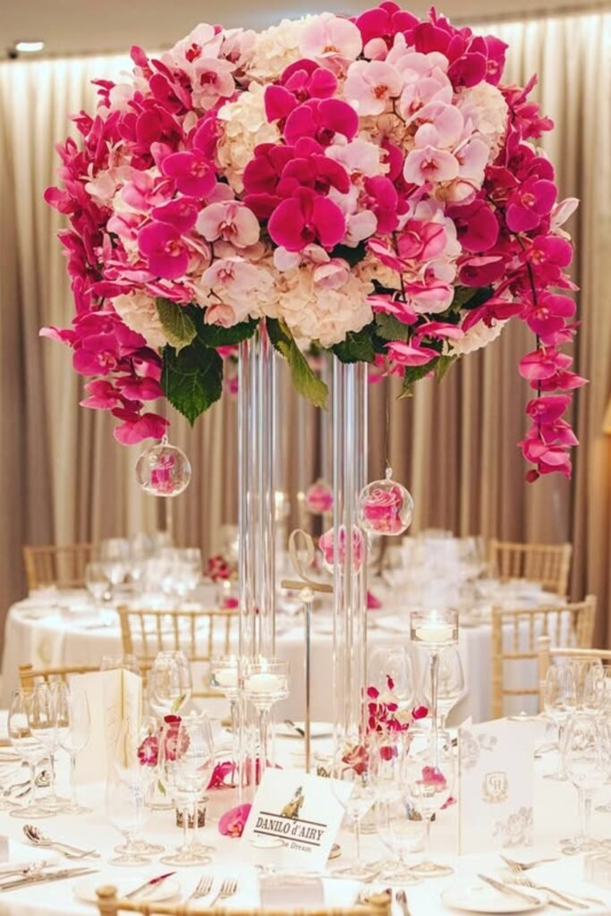 Go vertical with pink orchid centerpieces to add luxury height while keeping tables airy, elegant, and easy for guests to converse.