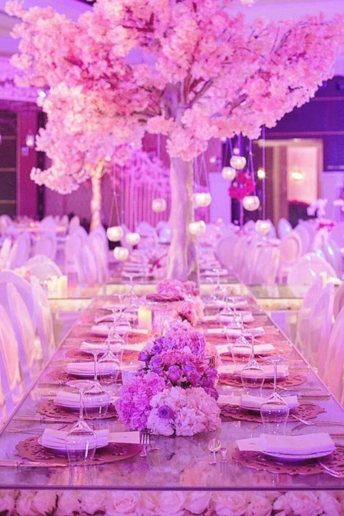 This setup works best for evening receptions because pink tones glow beautifully under uplighting, candles, and soft ambient lighting.