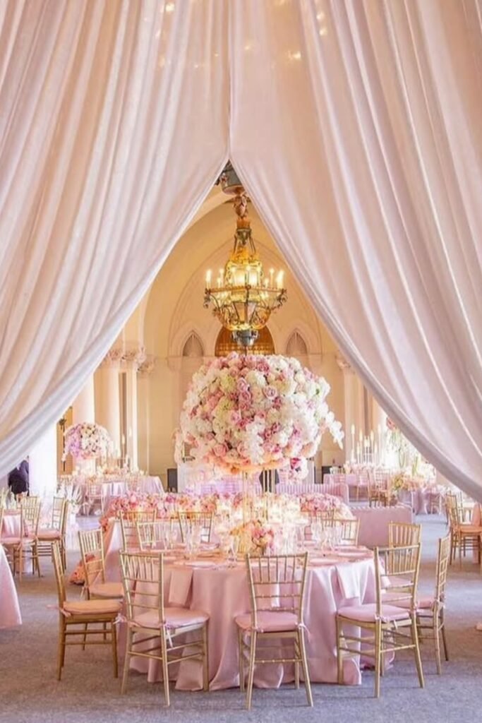 Balance the draping with neutral chairs and metallic accents so pink enhances the space rather than dominating every visual detail.