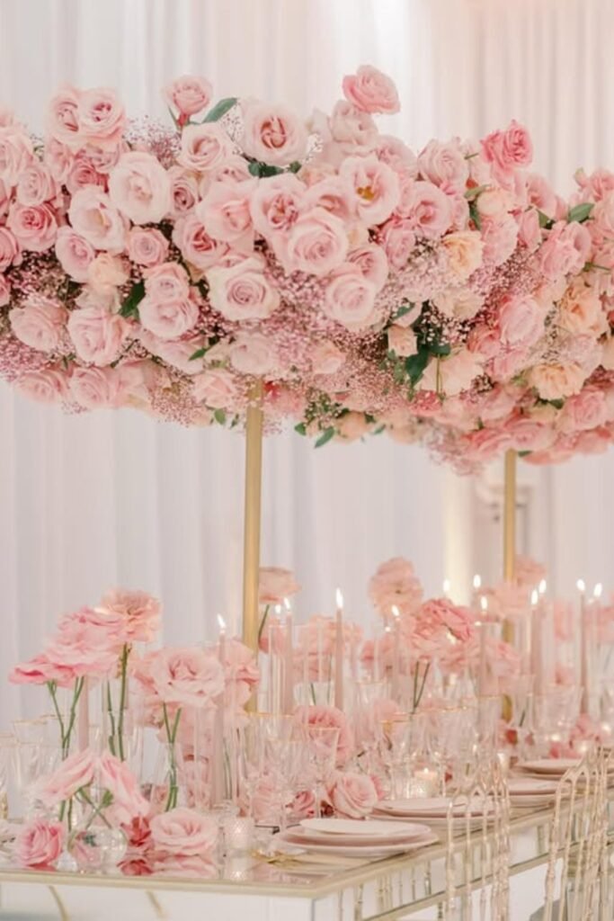 Create drama by placing pink florals overhead, drawing the eye upward and making tables feel immersive without crowding guest space.