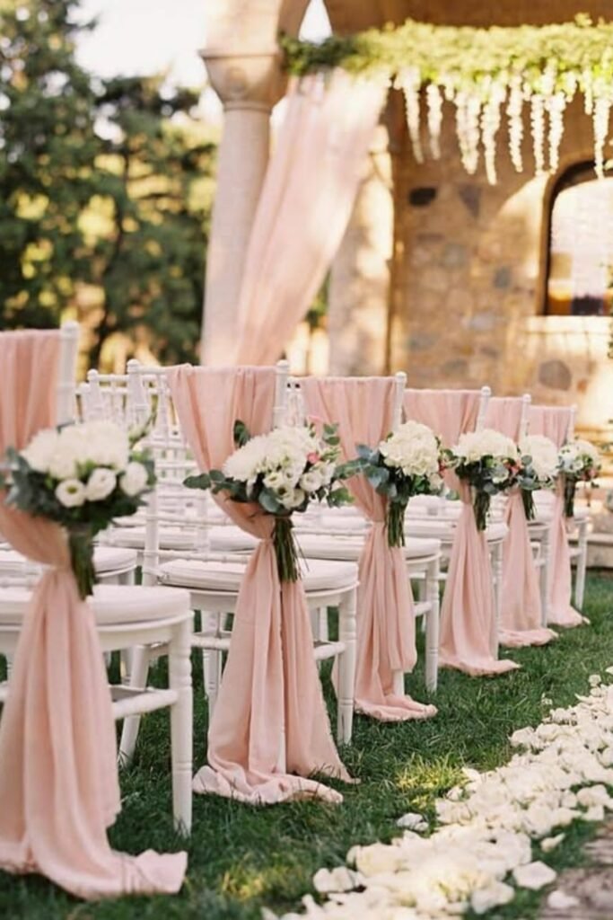 Wrap blush fabric around ceremony chairs to subtly introduce pink while guiding guests’ eyes toward the altar without overwhelming the outdoor setting.