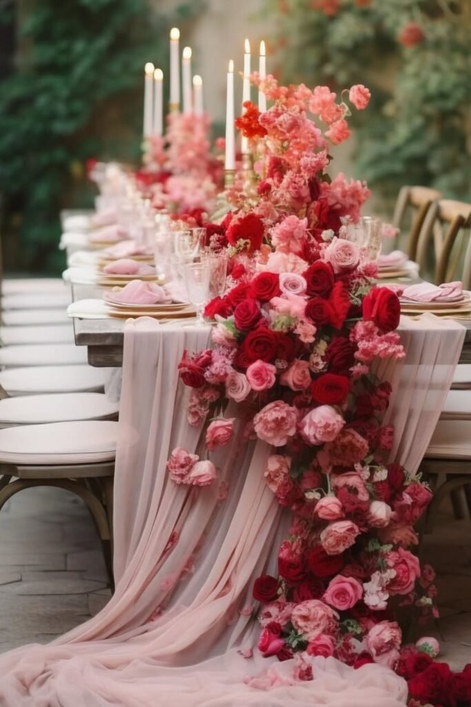 Use cascading pink florals and fabric runners to turn long tables into statement pieces without relying on tall centerpieces or overhead installs.