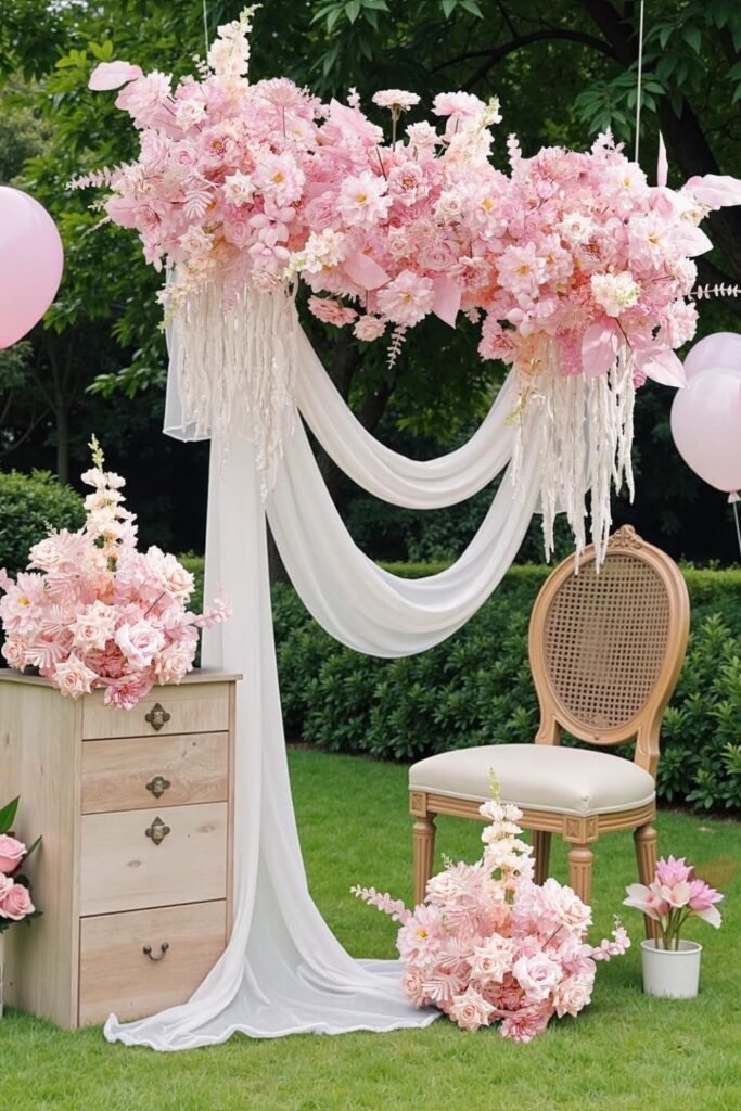 Create a dedicated pink ceremony vignette using florals, soft draping, and balloons to add charm without redesigning the entire venue layout.
