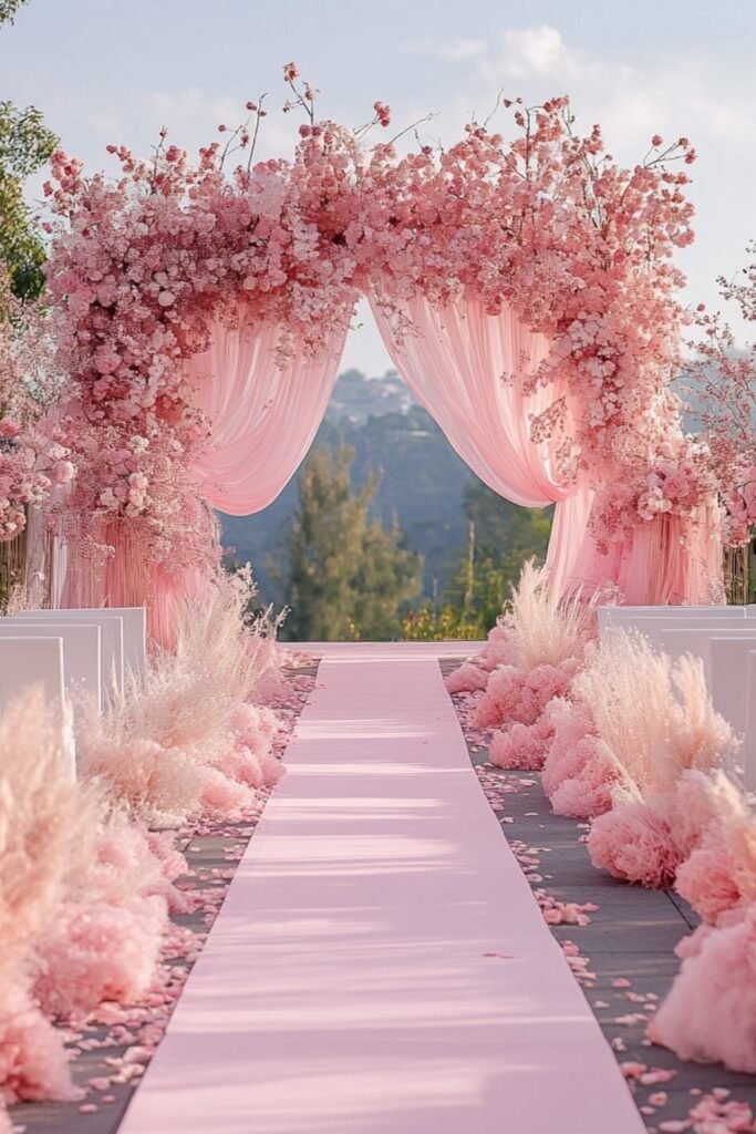 This works beautifully for garden weddings where greenery balances pink, keeping the aisle romantic, light, and naturally elegant throughout the ceremony.