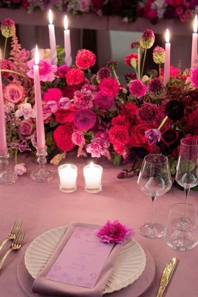 This approach works best for formal dinners where symmetry, repetition, and warm lighting elevate pink without excess or visual noise appearing.