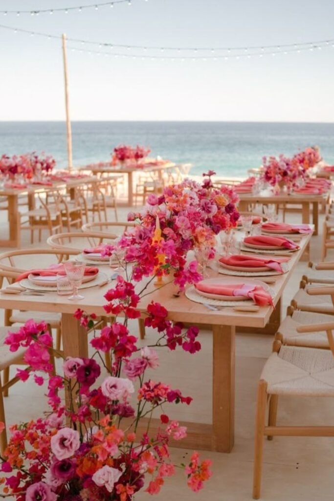 Use vibrant pink florals on wooden tables to energize beach receptions while ocean views naturally soften the color palette around you.