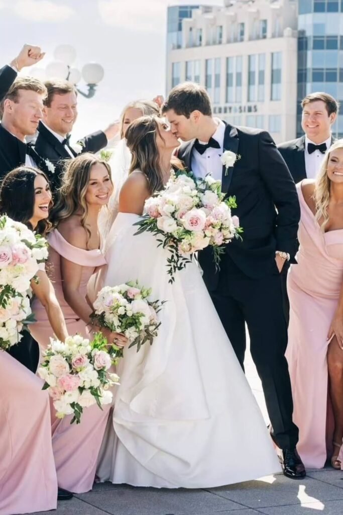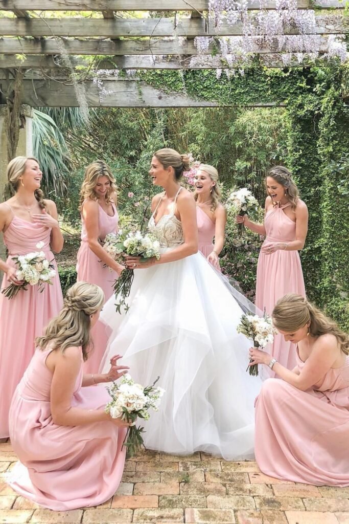 Soft blush bridesmaid dresses help echo your pink wedding theme while keeping the bride visually centered and elevated through photos.