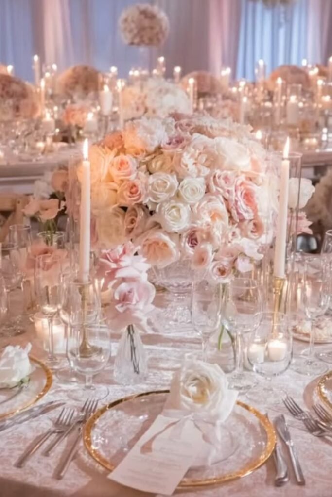 Layer blush and ivory florals with candlelight to create reception tables that feel timeless, romantic, and softly luxurious for evening celebrations.