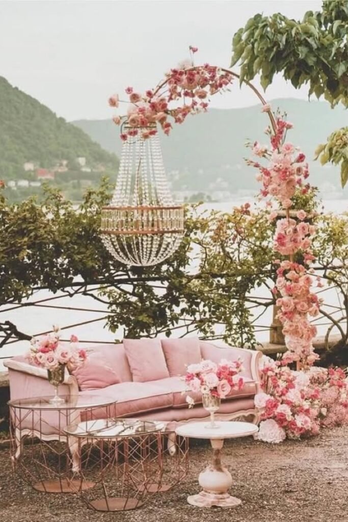 Create a soft pink lounge area so guests can relax, chat, and enjoy the wedding atmosphere without leaving the visual theme behind.
