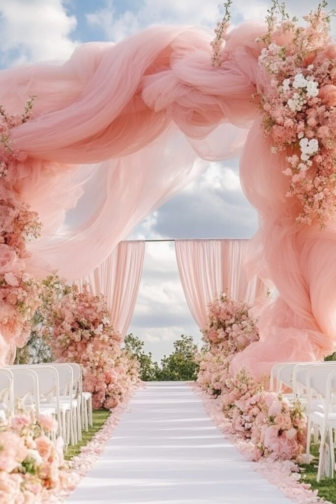 Go for soft pink draping on your ceremony arch to add romance, movement, and depth without relying on heavy floral coverage.