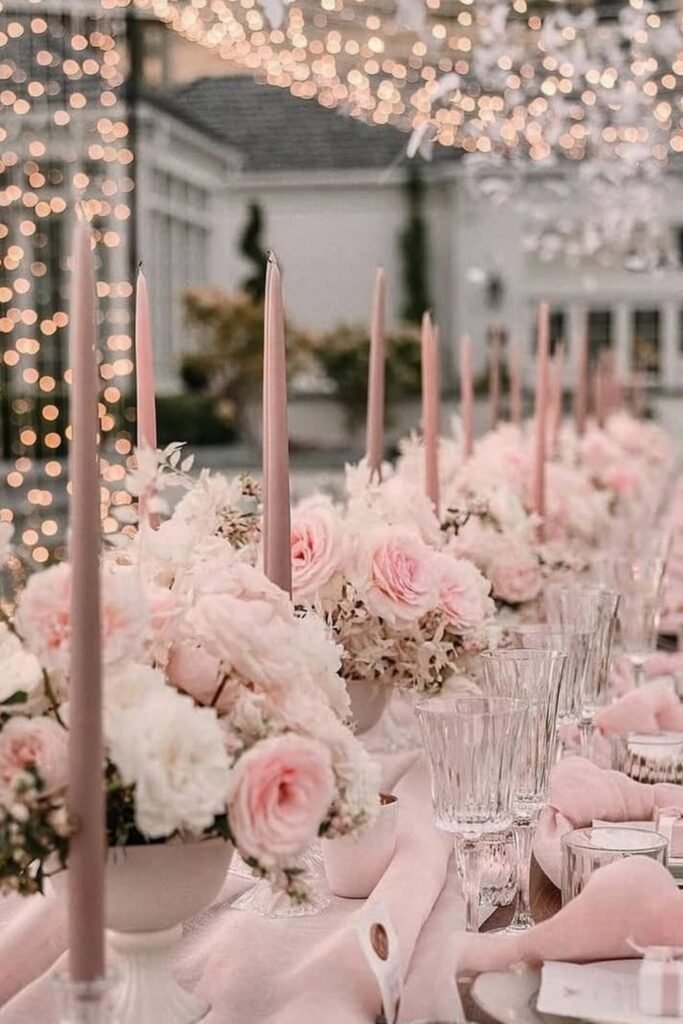 This setup shines for evening weddings because candlelight enriches pink shades and adds warmth without relying on excessive florals or lighting.