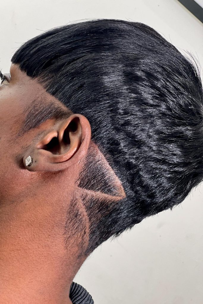 Typically, the sides or back of the hair are shaved to feature intricate patterns or shapes, while the top stays longer for contrast.
