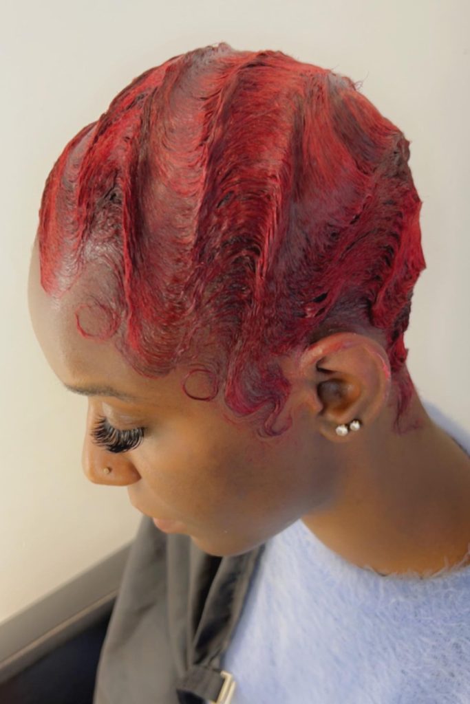 To achieve this, start by using a high-quality red dye. Then, apply wave gel to damp hair and sculpt the waves with a comb, letting it set under a dryer.
