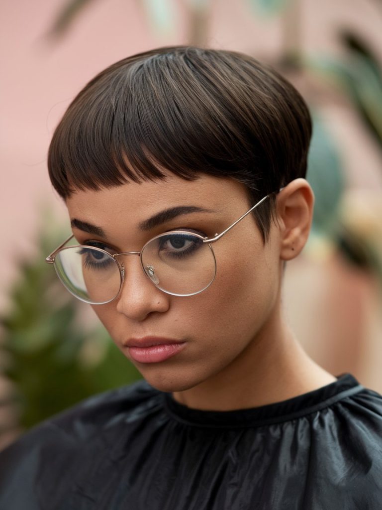The bowl cut pixie is a chic hairstyle with a rounded shape, where the hair is cut evenly around the head, giving it a bowl-like look.