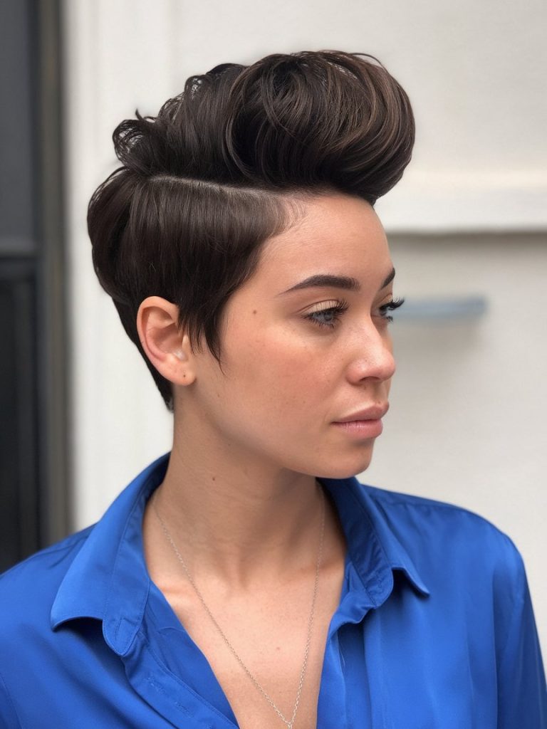 The pompadour pixie is a chic hairstyle that blends short sides with a full, voluminous top, giving you a bold and fashionable appearance.