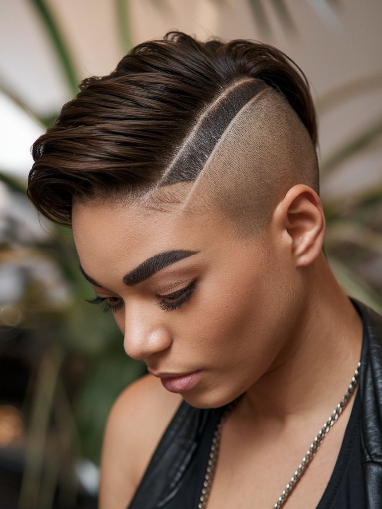 This chic pixie cut blends a side shave with an undercut, featuring a longer top for a striking contrast.