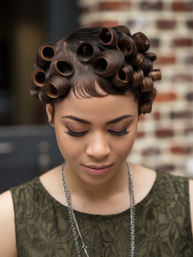 The Retro Pixie with Finger Curls is a stylish nod to the past with a contemporary twist. This look features short, tight curls styled close to the head, inspired by the glamorous 1920s.
