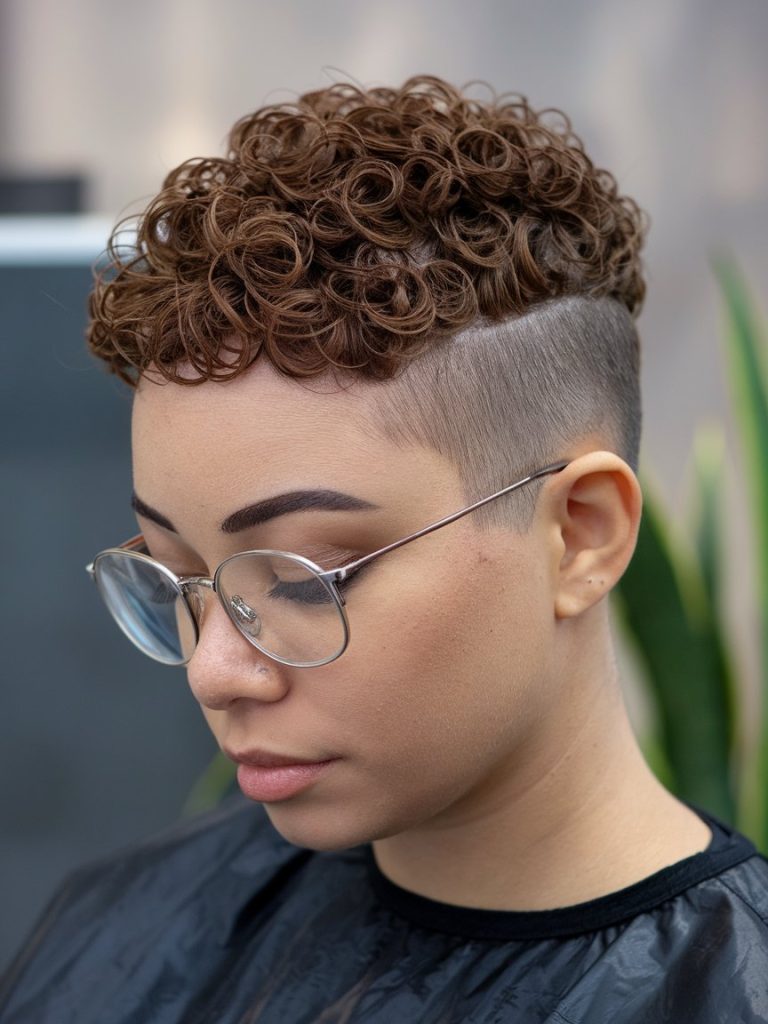 This pixie cut offers a chic and polished look by combining soft, defined curls on top with tapered sides. The curls provide volume and texture, while the sleek sides maintain a modern edge.