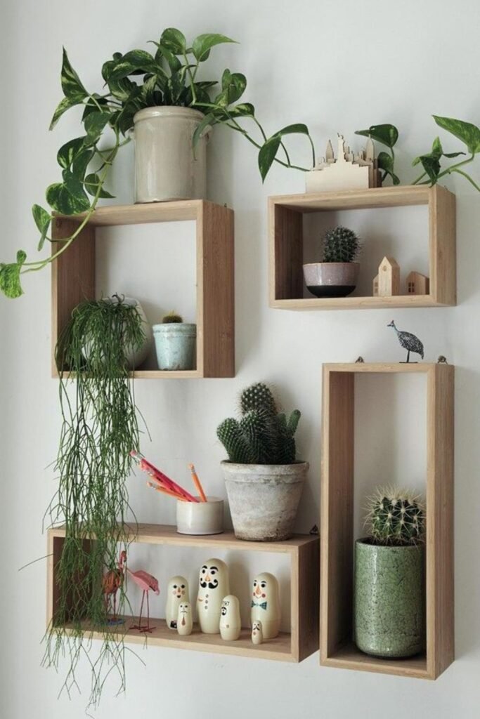 Order matters when plants grow at different speeds. A cubby-style wall shelf like this keeps fast growers from overwhelming slower ones.