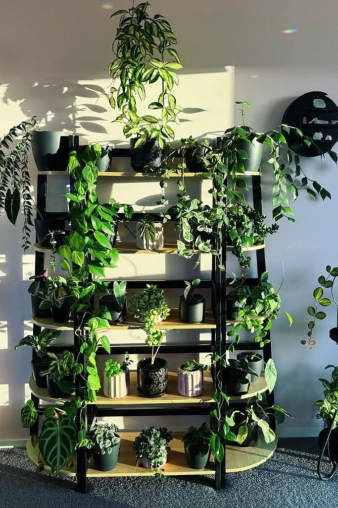 Corners stop feeling dead once plants grow upward instead of outward. Tiered stands like this let each plant sit at a different light level.